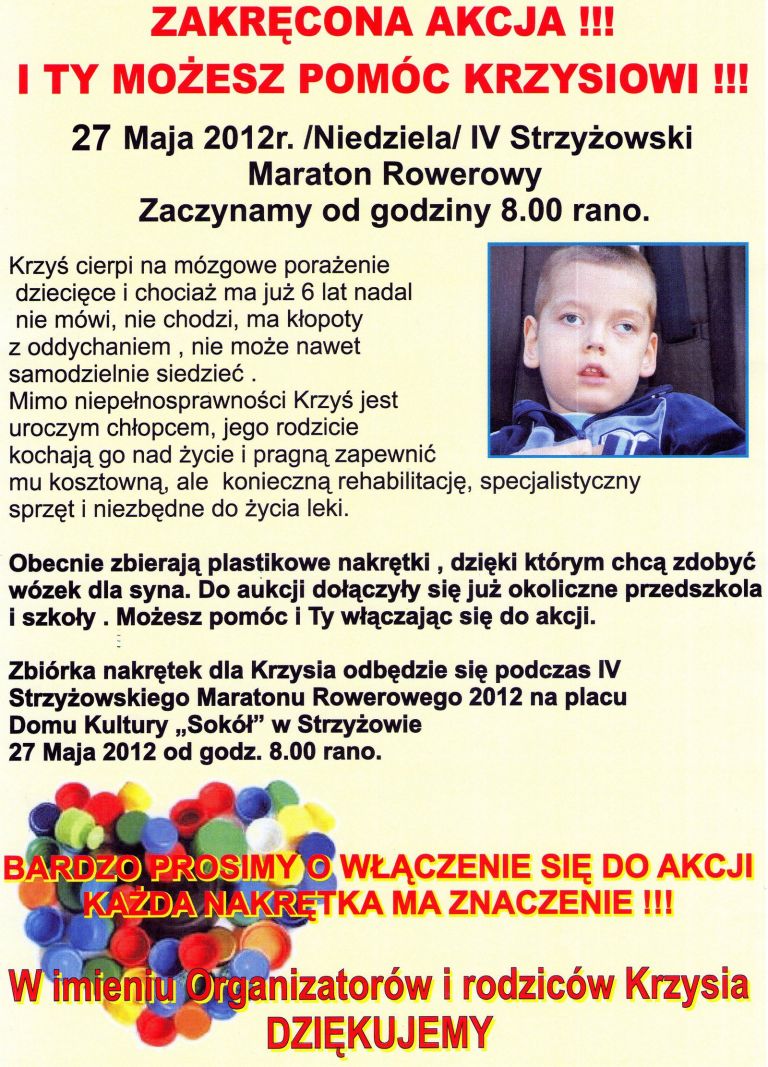 Krzysiu Bury ma sześć lat. Zamieszkały w gminie Czudec chłopiec cierpi na mózgowe porażenie dziecięce. Nie mówi, nie chodzi, ma kłopoty z oddychaniem, nie może nawet samodzielnie siedzieć. Rodzice w miarę swych możliwości finansowych starają się mu zapewnić rehabilitację, specjalistyczny sprzęt i niezbędne do życia leki, które są bardzo kosztowne. Nie na wszystko ich stać. Dlatego zwracają się z apelem do szkół, przedszkoli, mieszkańców powiatu strzyżowskiego o zbieranie plastikowych nakrętek, dzięki którym uda im się zakupić wózek dla synka. Nie pozostańmy obojętni na los Krzysia. Pamiętajmy, nakrętka nic nie kosztuje, a dla chłopca jest bardzo cenna. Nie zapomnij przyjdź na rowerowe zmagania z nakrętkami dla Krzysia! Zbierane będą one na placu przed Domem Kultury „Sokół”.w Strzyżowie