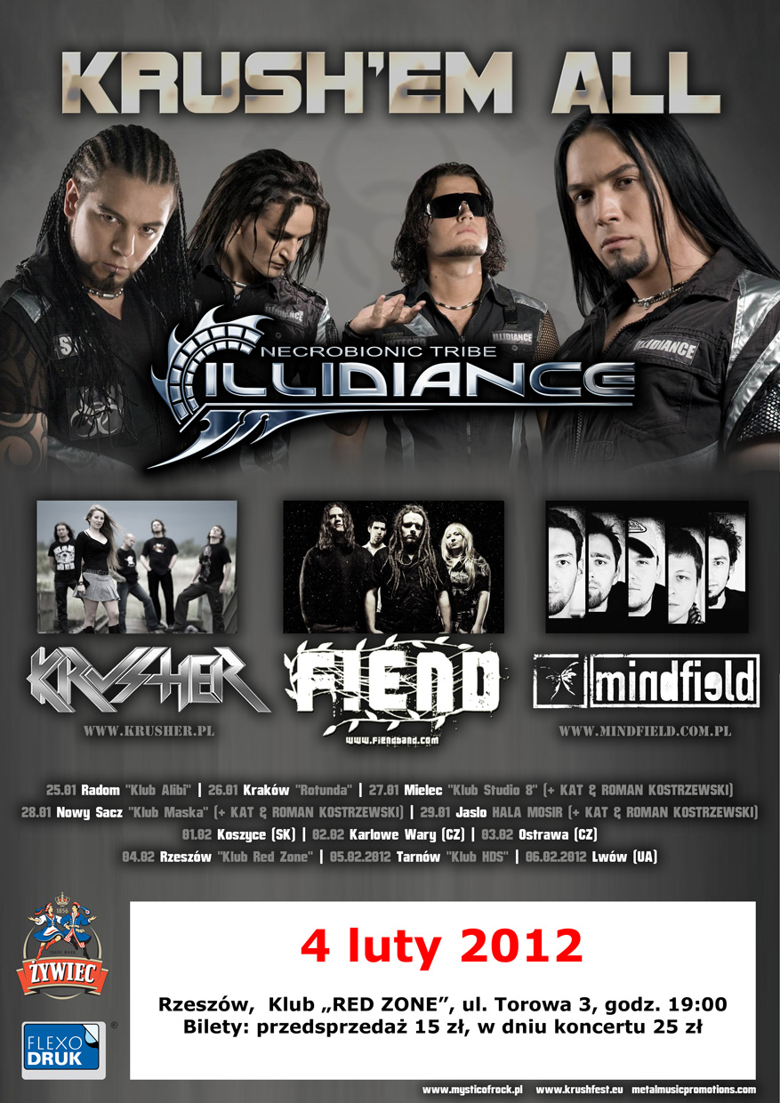 Serdecznie zapraszamy na koncertowy wieczór w Rzeszowie do klubu „Red Zone” z okazji Międzynarodowej Trasy koncertowej KRUSH'EM ALL TOUR z udziałem: ILLIDIANCE, KRUSHER, FIEND, MINDFIELD