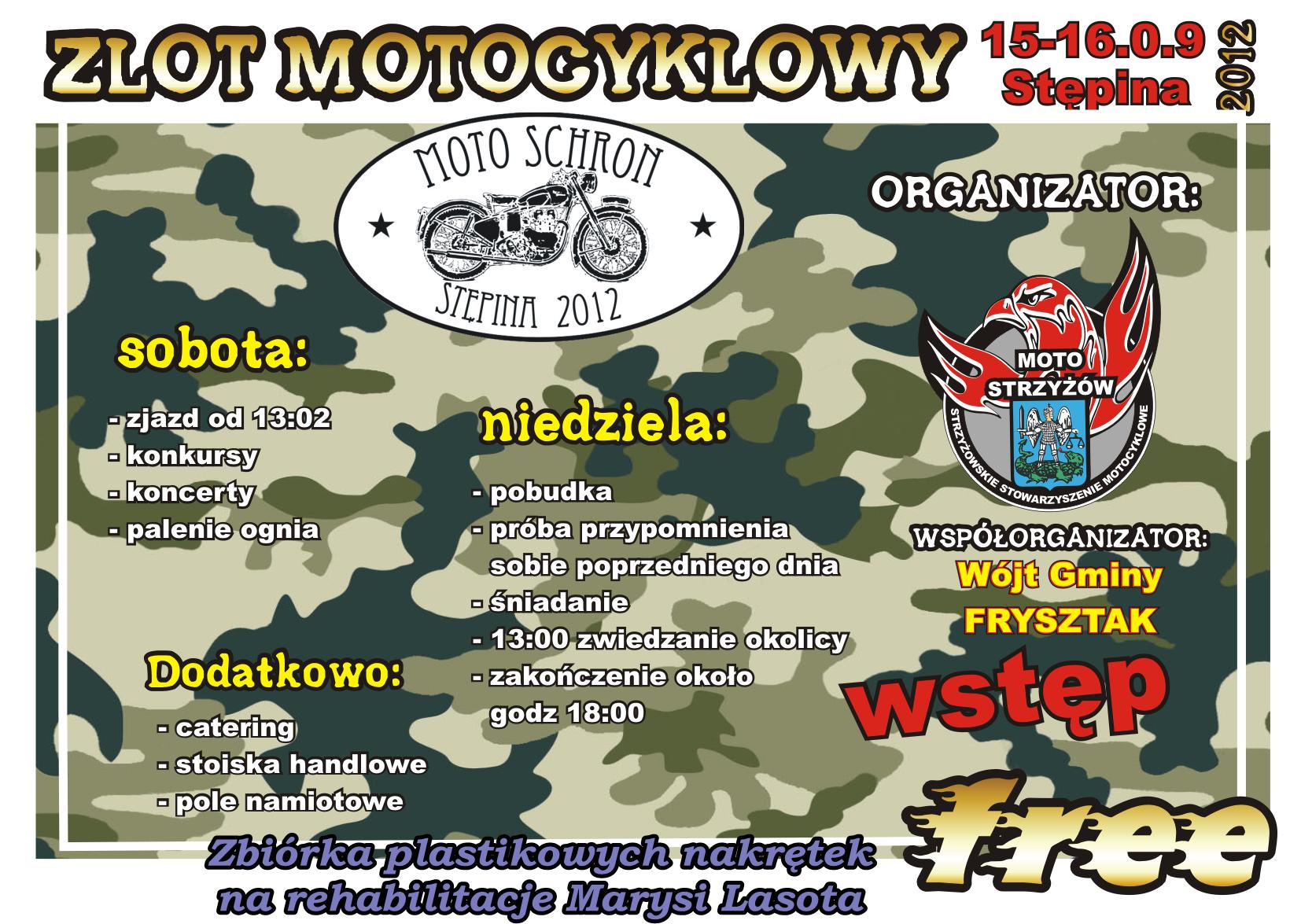 Zapraszamy na "Moto Schron" organizowany przez Strzyżowskie Stowarzyszenie Motocyklowe "Moto Strzyżów". Teren imprezy bardzo dobrze znany, kompleks schronów w Stepinie k/Frysztaka. Wjazd darmowy. Koncerty, catering, stoiska handlowe Zbiórka nakrętek plastikowych na rehabilitacje marysi Lasoty.