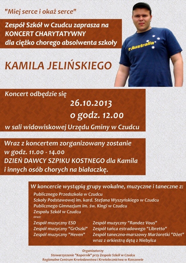 26 października (sobota) w sali widowiskowej Urzędu Gminy w Czudcu odbędzie się koncert charytatywny dla ciężko chorego Kamila Jelińskiego - absolwenta Zespołu Szkół w Czudcu. Więcej informacji na plakacie.