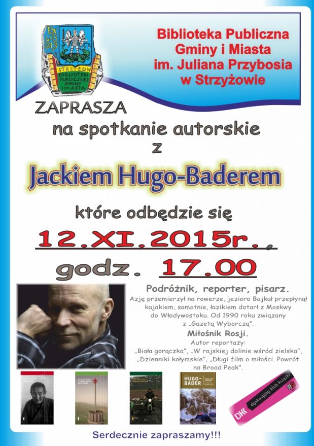 Biblioteka Publiczna Gminy i Miasta im. Juliana Przybosia w Strzyżowie zaprasza na spotkanie autorskie z Jackiem Hugo-Baderem, które odbędzie się 12 listopada o godz. 17:00.