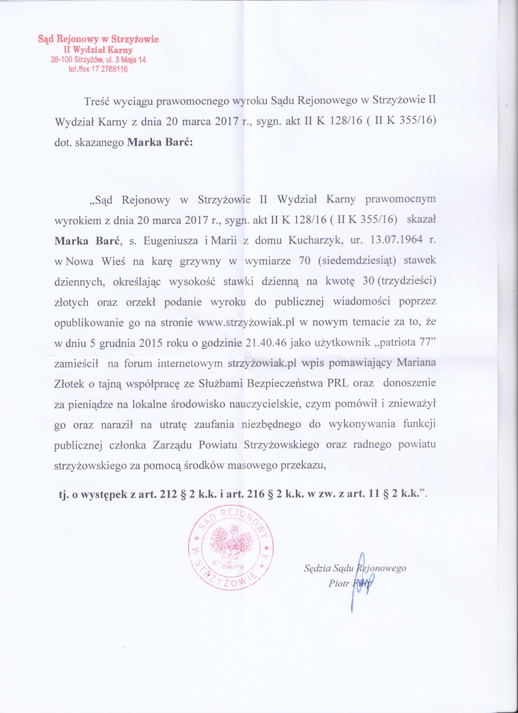 W dniu 5 grudnia 2015 roku o godzinie 21.40.46 jako użytkownik "patriota 77" zamieścił na forum internetowym strzyzowiak.pl wpis pomawiający Mariana Złotek o tajną wspólpracę ze Służbami Bezpieczeństwa PRT oraz donoszenie za pieniądze lokalne środowisko nauczycielskie, czym pomówił i znieważył go oraz naraził na utrate zaufania niezdędnego do wykonywania funkcji publicznej członka Zarządu Powiatu Strzyżowskiego oraz radnego powiatu strzyżowskiego za pomocą środków masowego przekazu,