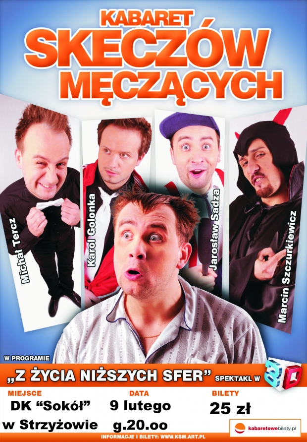 Podczas występu w strzyżowskim Domu Kultury "Sokół" Kabaret Skeczów Męczących zaprezentuje swój najnowszy program skeczów „Z życia niższych sfer - spektakl w 3D”, będący adaptacją nigdy wcześniej niepublikowanych opowiadań Mrożka*. Zrealizowany z rozmachem godnym Broadwayowskich musicali spektakl, jest próbą odpowiedzi na fundamentalne pytanie "jak żyć panie premierze"? Technologia 3D, która jest niczym innym jak tanim chwytem marketingowym, przybliży i uwypukli problemy przeciętnego Polaka. Twórcom spektaklu przyświeca jedna zasada - przede wszystkim ma być bardzo śmiesznie. Zobaczcie więc czego wartościowego można dowiedzieć się od pacjenta w szpitalu psychiatrycznym, spotkajcie legendarne już postacie np. Kłaka i Śrubę, w całkiem nowych odsłonach, dowiedzcie się na jakie zapomogi możecie liczyć, nawet jeśli ich nie potrzebujecie. Bo każdy z nas w niższych sferach znajdzie coś dla siebie i coś o sobie, a jak nie - to zawsze jest 3D.