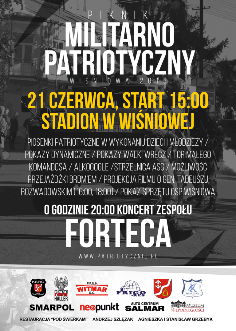 Zapraszamy na Piknik Militarno-Patriotyczny, który odbędzie się 21 czerwca 2015r. na stadionie w Wiśniowej. Na zakończenie pikniku odbędzie się koncert zespołu Forteca.| O mieście Strzyżów |