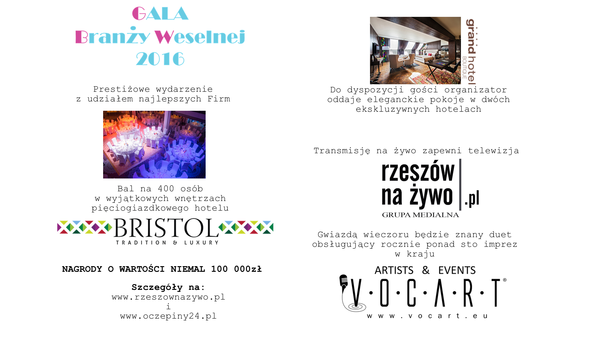 W Gali będzie uczestniczyć około 400 osób, a całość będzie transmitowana na żywo przez telewizję rzeszownazywo.pl oraz przez dwanaście partnerskich portali telewizyjnych, Podkarpacki Portal Ślubny oczepiny24.pl, a także w sieciach kablowych Podkarpacia i Małopolski. Gwiazdą wieczoru będzie utalentowany duet: Piotr Kulbicki & Agata Świerczewska, czyli popularna grupa "Vocart", wykonująca ponad 100 koncertów rocznie w całym kraju.