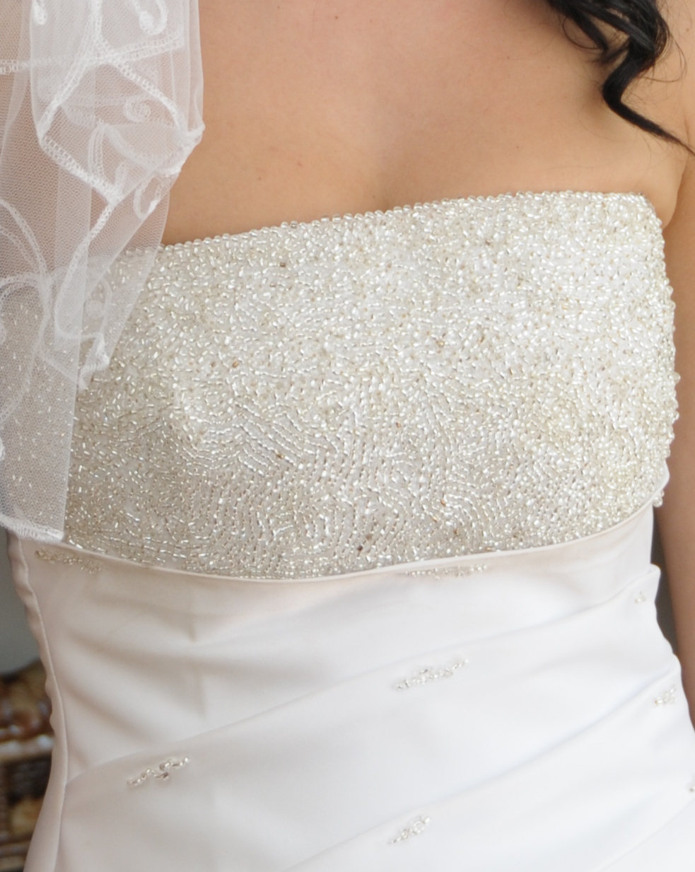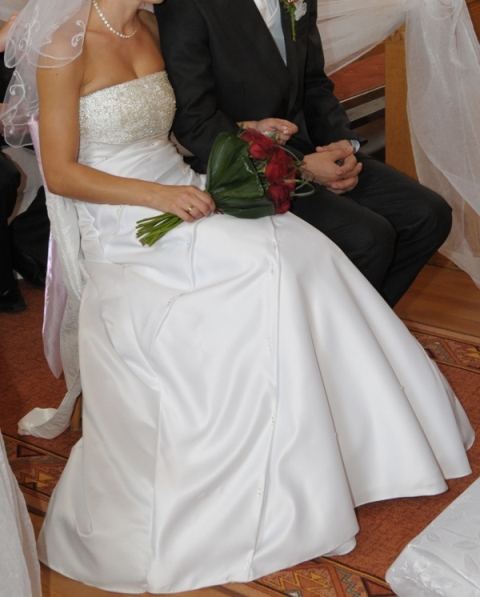 Sprzedam suknię jednoczęściową, rozmiar 36-38, z tyłu sznurowana, a więc można ją dopasować do różnych sylwetek. Suknia zdobiona jest bardzo gustownie ręcznie przyszywanymi koralikami, które pięknie się mienią w słońcu. Koraliki wyszyte są na biuście, z tyłu wokół sznurowań tworzą trójkąt oraz delikatnie na całej sukni. Do sukni są przyszyte cieniutkie szelki pokryte koralikami takimi samymi jak zdobiona jest suknia, które można łatwo schować gdyby nie były potrzebne. Na życzenie wyślę więcej zdjęć na maila. Suknię sprzedam za 700 zl. Zachęcam do przymierzenia