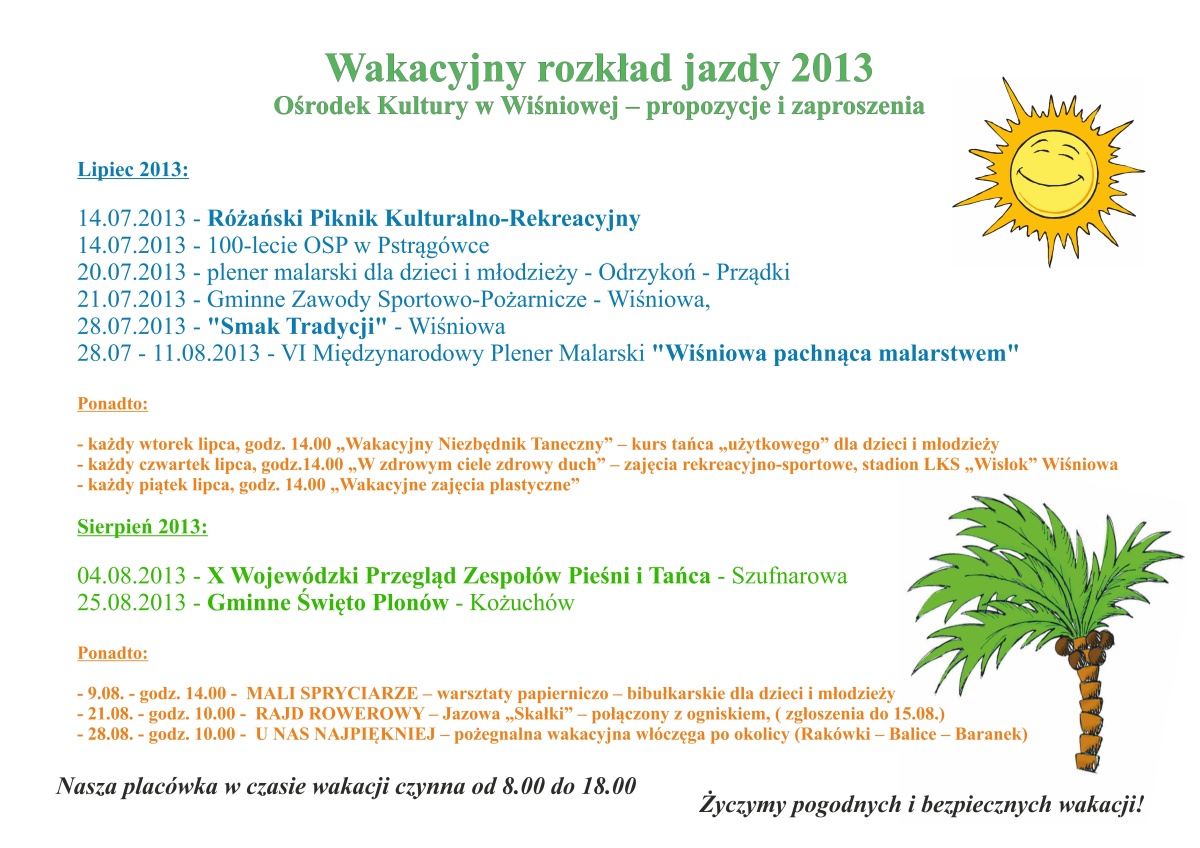 Rozpoczęcie wakacji to upragniony okres dla wszystkich. Piękna pogoda, urlopy, wypoczynek w pełni. Specjalnie dla was okoliczne gminy przygotowały mnóstwo ciekawych atrakcji.