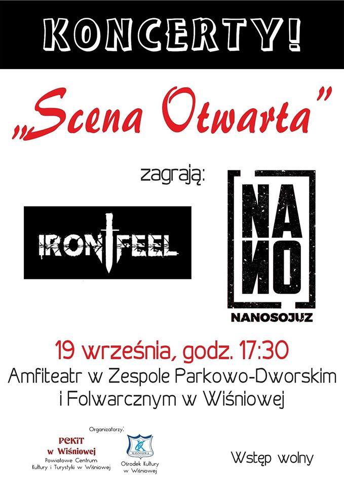 "Scena Otwarta" - plenerowe koncerty zespołów rockowych, zagra m.in. Nanosojuz. Termin: 19 września, godz. 17:30. Miejsce: Amfiteatr w Zespole Parkowo-Dworskim i Folwarcznym w Wiśniowej.