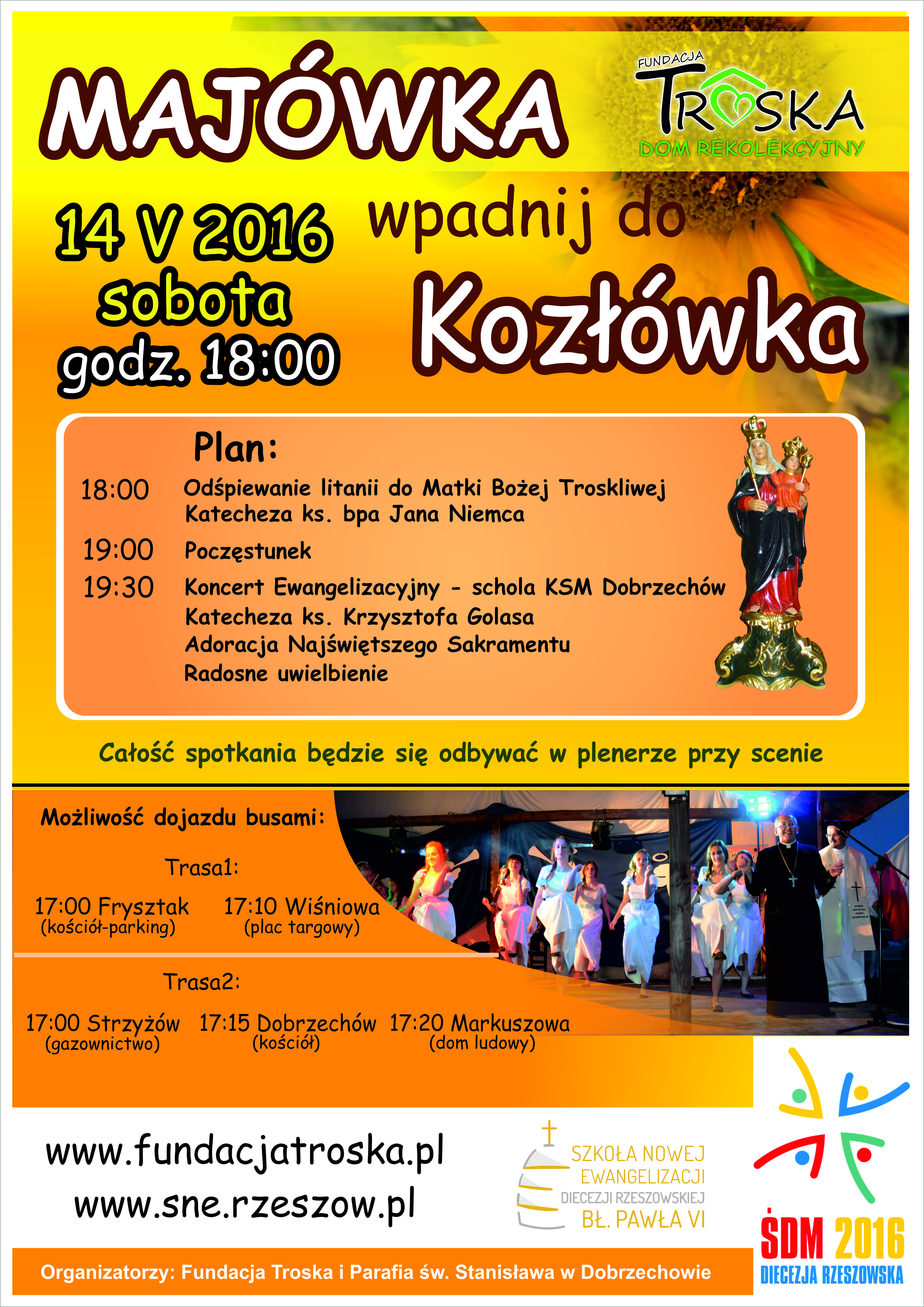 W ramach przygotowania do Światowych Dni Młodzieży w sobotę, 14 maja, Szkoła Nowej Ewangelizacji bł. Pawła VI wraz z Parafią św. Stanisława z Dobrzechowa organizuje ewangelizacyjną majówkę w Kozłówku przy domu rekolekcyjnym TROSKA. Rozpoczęcie o godz. 18:00.