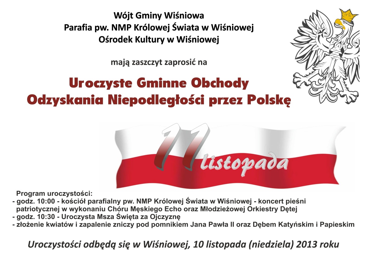 Wójt Gminy Wiśniowa, Parafia w Wiśniowej oraz Ośrodek Kultury w Wiśniowej zapraszają wszystkich Mieszkańców na UROCZYSTE GMINNE OBCHODY ODZYSKANIA NIEPODLEGŁOŚCI PRZEZ POLSKĘ.