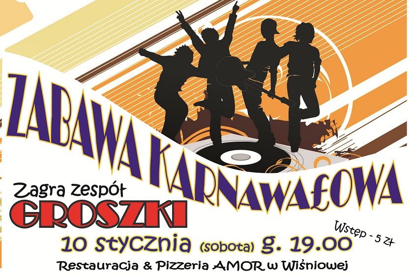 ZABAWA KARNAWAŁOWA zagra zespół GROSZKI 10 stycznia (sobota) godz. 19.oo Restauracja & Pizzeria AMOR w Wiśniowej wstęp - 5 zł ZAPRASZAMY