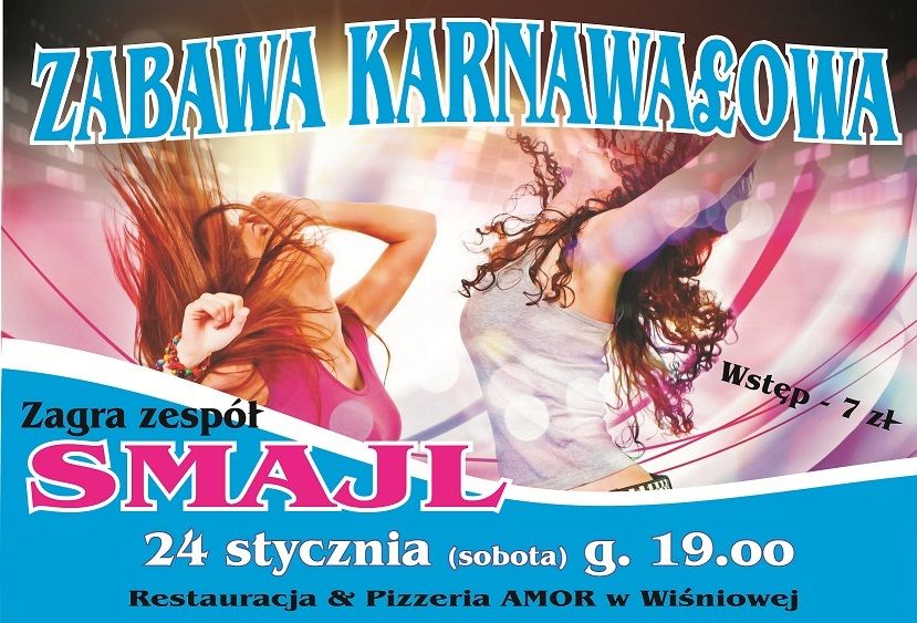 ZABAWA KARNAWAŁOWA zagra zespół SMAJL 24 stycznia (sobota) g. 19.oo wstęp - 7 zł Restauracja & Pizzeria AMOR w Wiśniowej ZAPRASZAMY